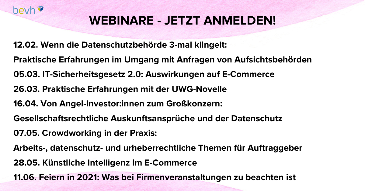 In Kooperation mit dem bevh können Sie sich kostenlos für unsere Webinare anmelden. Immer freitags, 10 bis 11 Uhr: